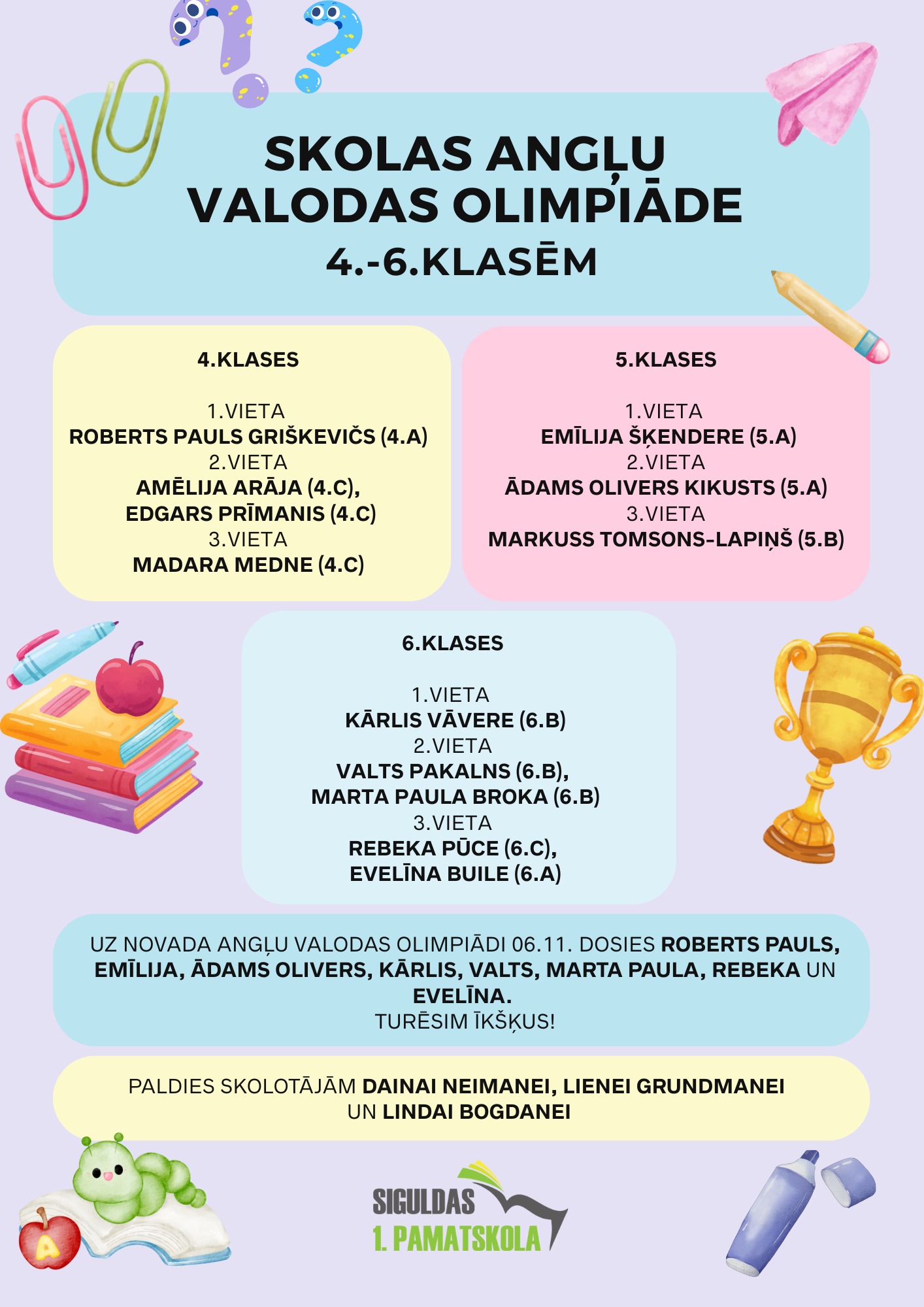 Skolas angļu valodas olimpiādes rezultāti 4.-6.klasēm. Apsveicam! 17 oktobris, 202517 oktobris, 2025 pēc Siguldas Pamatskola