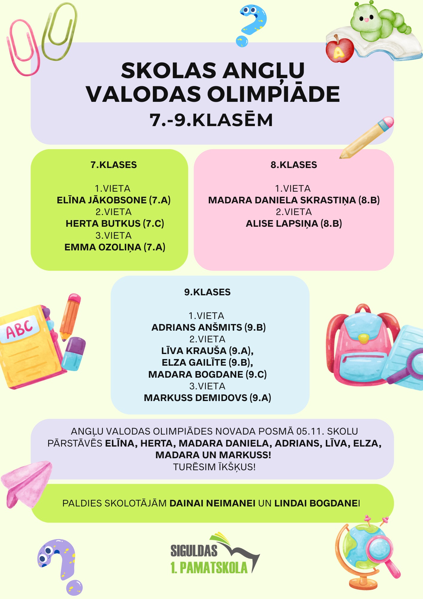 Skolas angļu valodas olimpiādes rezultāti 7.-9. klasēm. Apsveicam! 17 oktobris, 202517 oktobris, 2025 pēc Siguldas Pamatskola